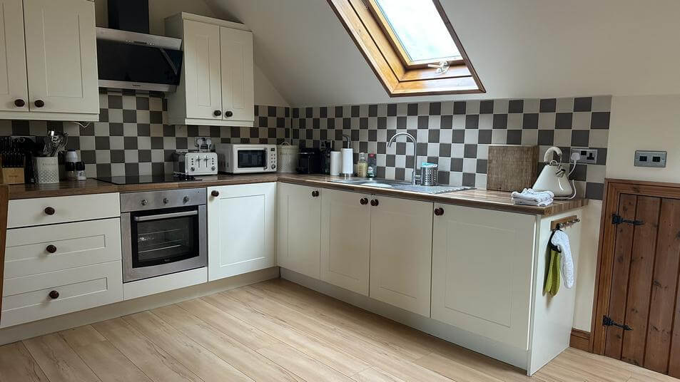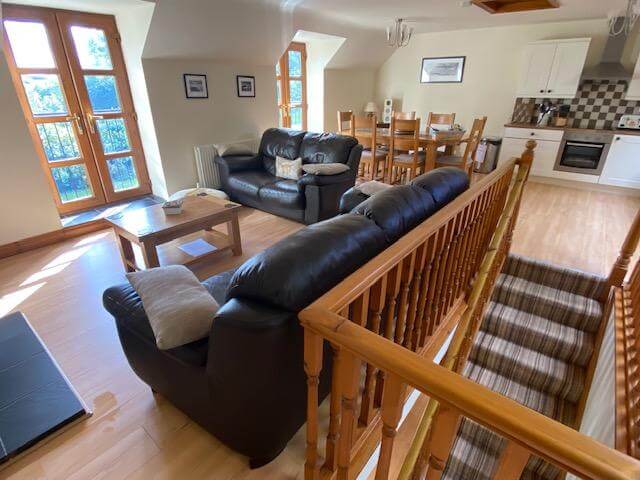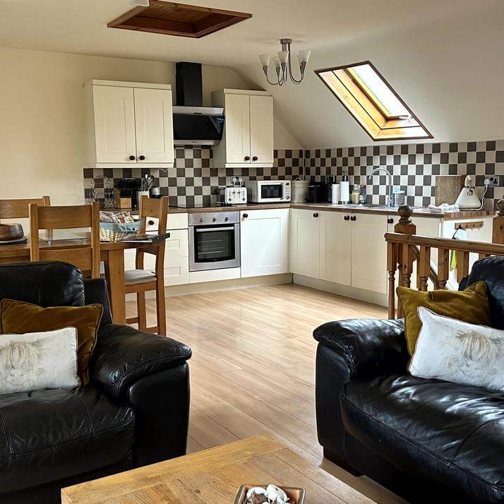 An open plan layout upstairs with two further sets of French doors with Juliet balconies make the most of those countryside views. A fully equipped kitchen that includes an induction hob, microwave, full-sized fridge freezer and dishwasher; leading from the kitchen a utility area features washing machine and tumble dryer. A generously proportioned dining area with table and chairs is adjacent to a sitting area benefiting from a log burner, comfy sofas, and a smart TV with Sky.
