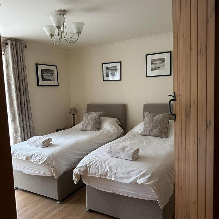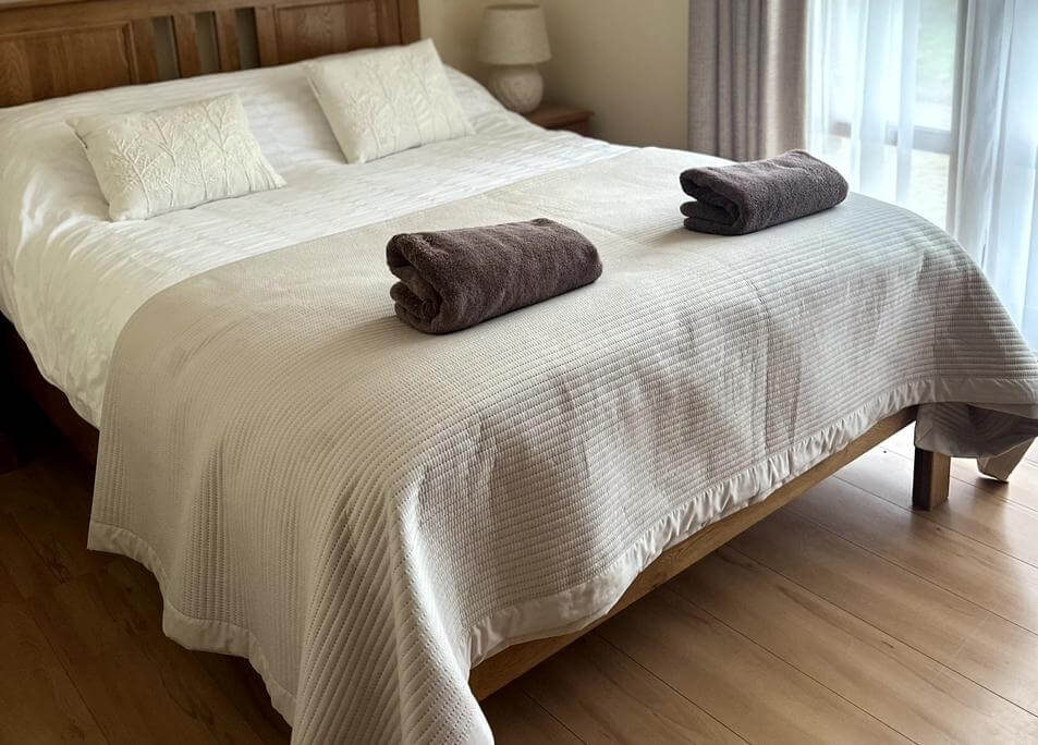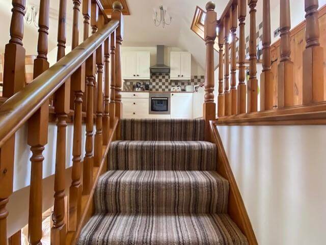Accommodating up to 5 adults, the cottage features an ‘upside down’ layout to make the most of the stunning open countryside view upstairs. The ground floor comprises of a twin bedroom with ensuite and a double bedroom – both of which have French doors leading out onto a paved area – as well as a single bedroom and family bathroom.